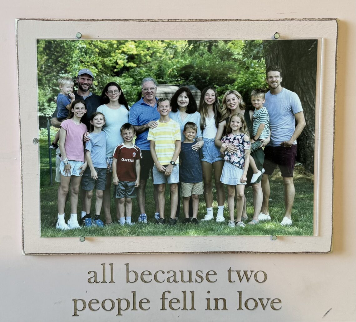 Don’t you love that opening photo? You know I do! It’s there for two reasons – first, because it’s fun for me to brag (via pictures) on the beautiful family God blessed us with. I picked up that frame at a thrift store, and thought it was a little comical to display this big ole’ family that evolved because Dick and I fell in love. As you see, we have 2 daughters, 2 sons-in-love, and 10 grandchildren. (If you take a moment and count, you’ll only find 9 in this photo. That’s because #10 is still in Kelsey’s womb, about 2 months from joining us. But they are all represented in one…